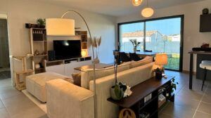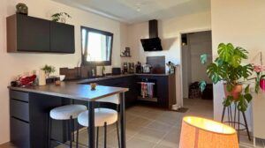 La cuisine ouverte s’intègre naturellement à l’espace, créant une atmosphère conviviale et propice aux échanges. Les larges ouvertures apportent une luminosité naturelle généreuse tout au long de la journée.