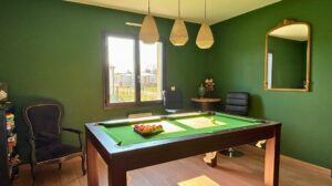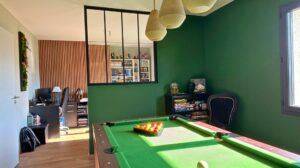 L’une des pièces accueille un espace billard dédié à la détente, tandis qu’une autre a été transformée en bureau et espace gaming. Cette configuration illustre parfaitement la flexibilité du modèle Bréhat.