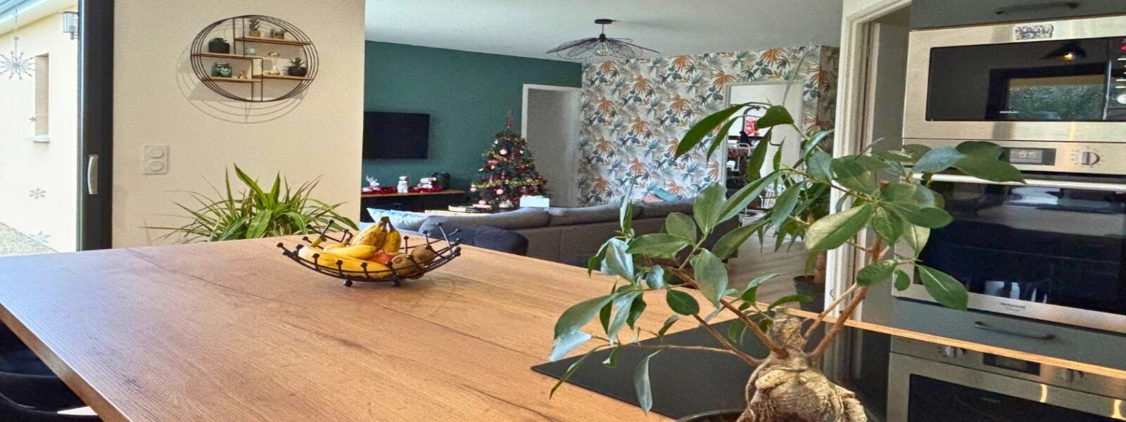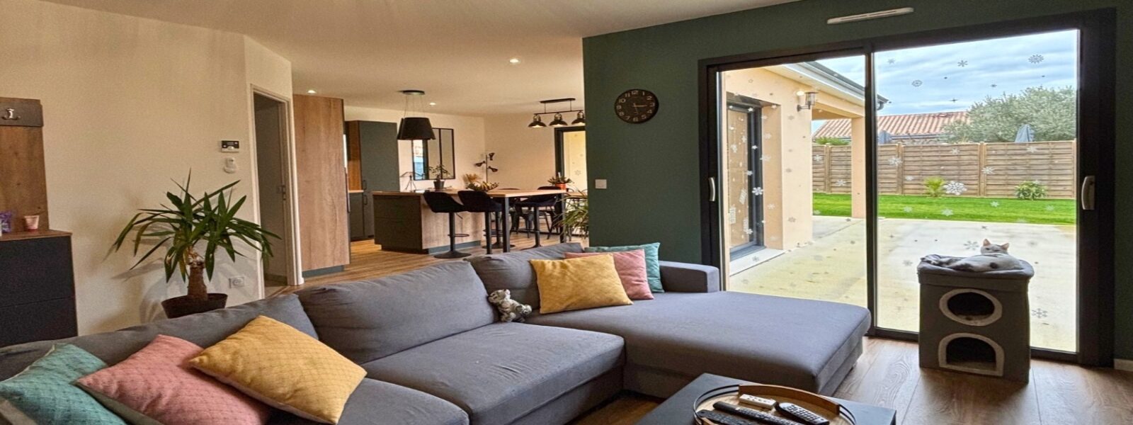 Véritable cœur de la maison, la pièce de vie de 50 m² a été pensée pour offrir de grands volumes tout en conservant une circulation fluide entre les différents espaces. Le séjour et le salon communiquent naturellement avec la cuisine en L, équipée d’un îlot central qui devient un point de rencontre privilégié au quotidien.