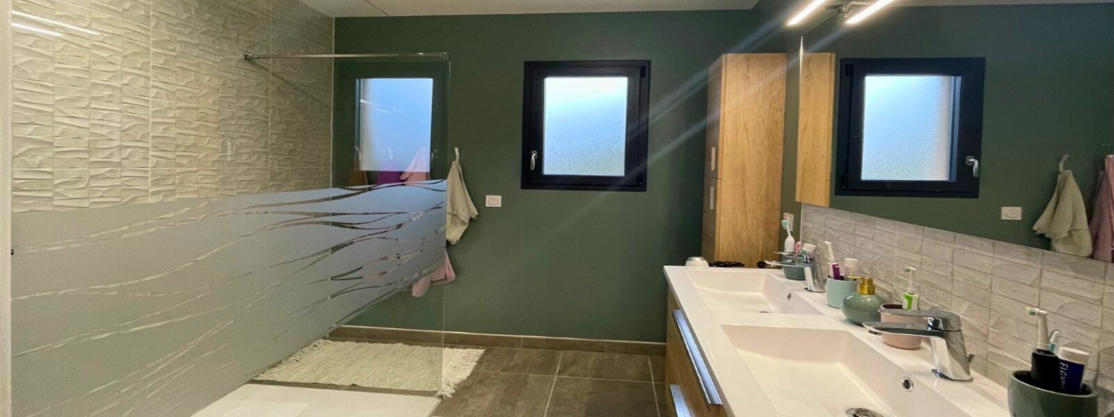 La salle d’eau moderne, équipée d’un receveur extra-plat de 160 cm, a été pensée pour conjuguer confort, esthétique et praticité au quotidien.